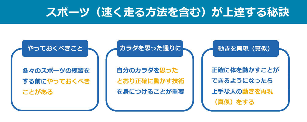 コオディネーション能力を身につけると、手本となる動きをよく見れば、すぐに自分の体で再現できるので上達するスピードがあがります。基準となるポイントの感覚も身についているので、いろんなスポーツで応用できますし、もちろん走り方にも有効なトレーニングになります。